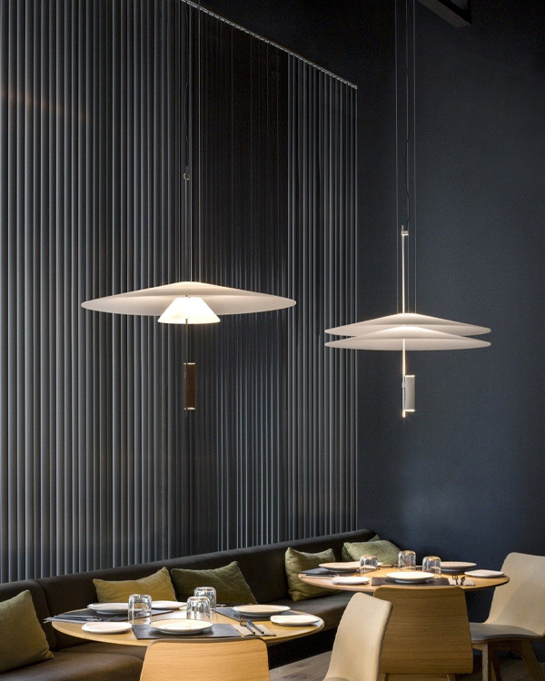 Flamingo 컬렉션에서 특히 매력적인 점은 반투명 플라스틱과 다양한 표면 마감의 대비입니다. 이것은 마치 레스토랑에 온듯한 식탁 조명과 같은 분위기를 만듭니다.